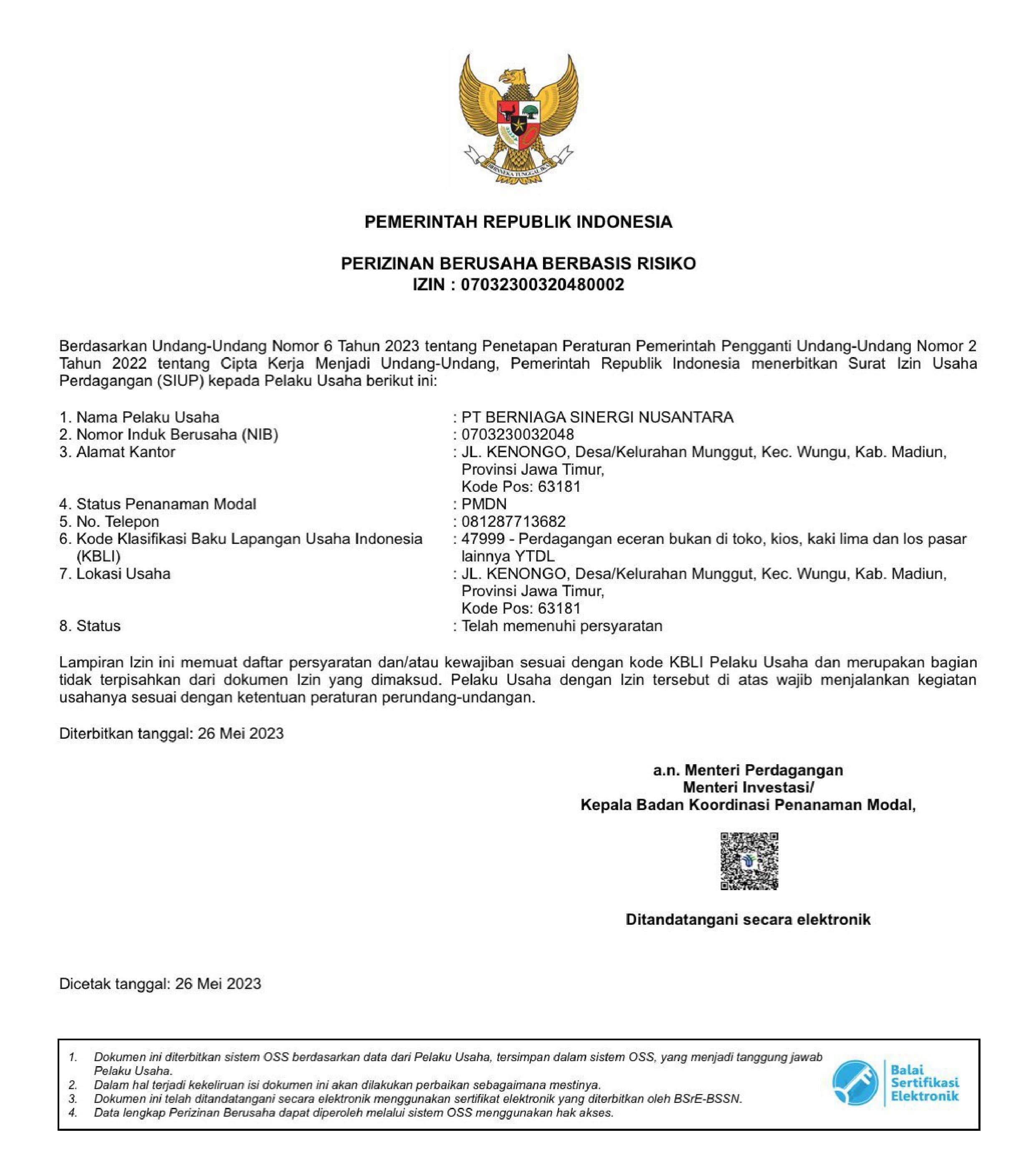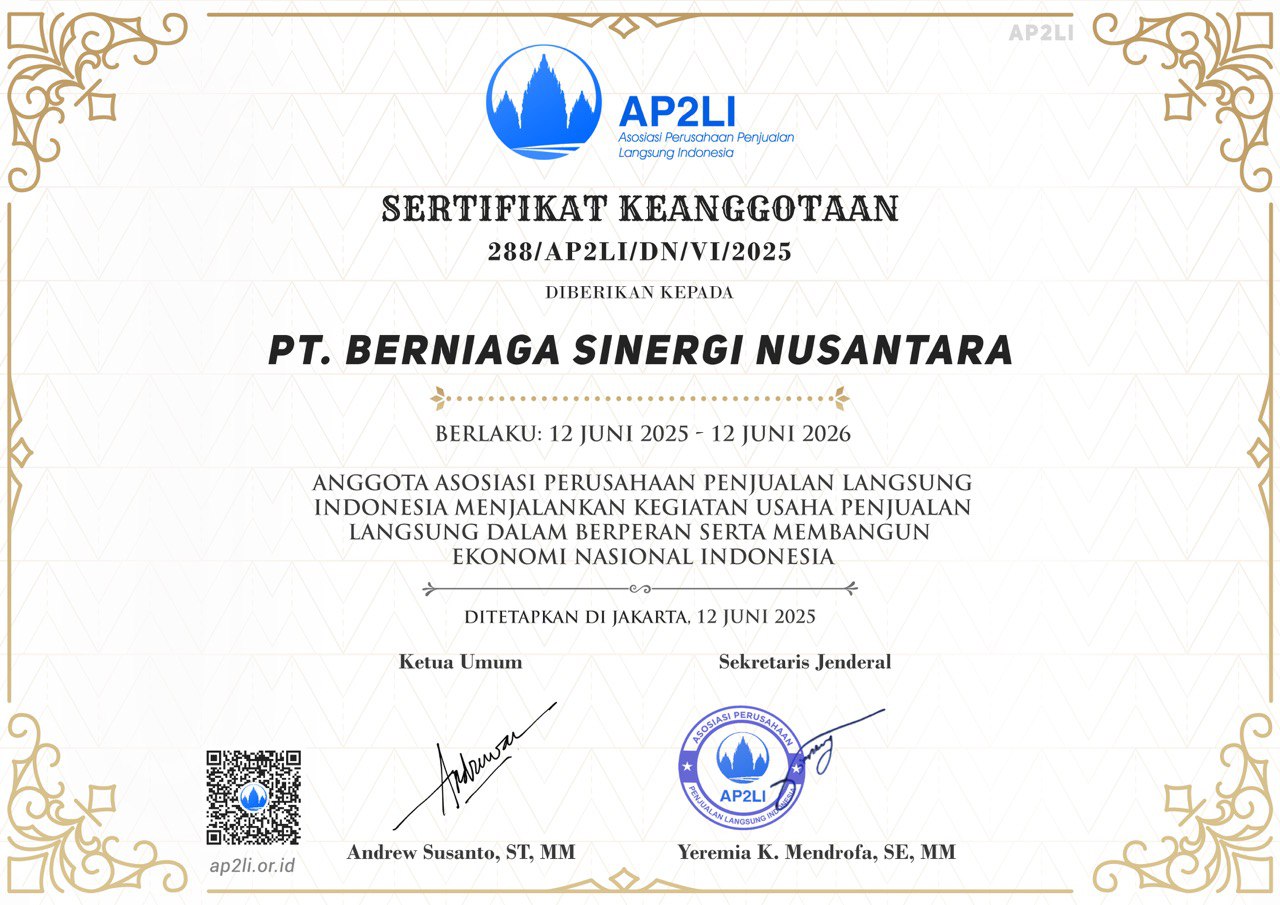 PT. Berniaga Sinergi Nusantara telah terdaftar dan terverifikasi bisnis perusahaannya serta marketing plan telah teruji sehingga aman dan dapat berjalan dengan baik.